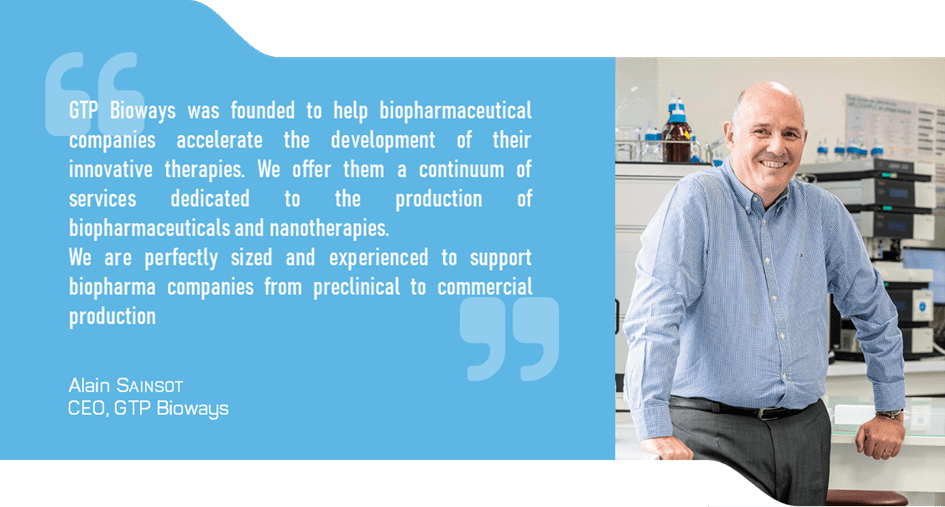 GTP Bioways was founded and is led by Alain Sainsot, previously Industrial Director and Director of Group Operations and Logistics at Pierre Fabre, and President of Amatsigroup.